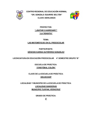 Este documento presenta dos proyectos para desarrollar habilidades matemáticas en niños de preescolar. El primer proyecto, "¿Quitar o agregar?", involucra actividades sobre suma y resta representadas como quitar y agregar objetos. El segundo proyecto, "La tiendita", implica que los niños jueguen a ser comerciantes y clientes para practicar el valor de las monedas y realizar compras. Ambos proyectos buscan que los niños aprendan conceptos matemáticos de una manera significativa a través del