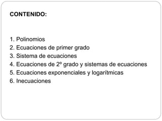 Este documento presenta un resumen de los principales temas de álgebra incluidos en el contenido de un curso. Estos temas incluyen polinomios, ecuaciones de primer y segundo grado, sistemas de ecuaciones, ecuaciones exponenciales y logarítmicas e inecuaciones. Se definen y explican conceptos como monomios, polinomios, sumas, restas, multiplicación y división de polinomios.