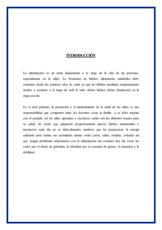 Este documento presenta un proyecto sobre la promoción de una alimentación nutritiva en niños de primer grado. El proyecto busca determinar cómo una alimentación saludable influye en el desempeño escolar de los niños e informar a los estudiantes y familias sobre una dieta balanceada. Se explican conceptos clave como los grupos de alimentos, la pirámide nutricional y los riesgos de una mala alimentación. El objetivo final es mejorar los hábitos alimenticios de los niños para apoyar su salud y rendim