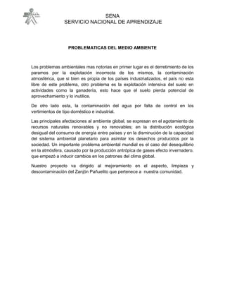 El documento describe un proyecto ambiental cuyo objetivo principal es realizar una jornada de limpieza y descontaminación del Zanjón Pañuelito para mejorar su aspecto y condiciones ambientales. Los objetivos específicos son reconocer los agentes de contaminación en el zanjón, concientizar sobre la responsabilidad ambiental y servir de ejemplo a la comunidad. El proyecto se llevó a cabo recolectando basura y desechos contaminantes del zanjón para preservarlo.