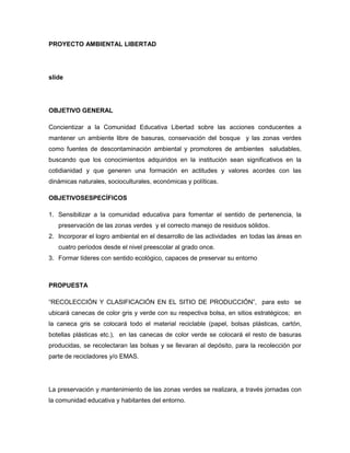 Este documento describe un proyecto ambiental en la Escuela Libertad en Pasto, Colombia. El proyecto busca concientizar a la comunidad educativa sobre la importancia de mantener un ambiente libre de basura a través de una campaña de reciclaje. El objetivo es reducir los desechos no biodegradables en la escuela mediante la recolección y clasificación de basura en contenedores de colores. El proyecto también involucra el mantenimiento de las zonas verdes de la escuela y la formación de líderes ambientales entre los estudiantes.