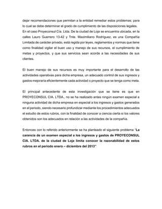 El documento describe un examen especial realizado a los ingresos y gastos de Proyeconsul CIA. Ltda. durante el período de enero a diciembre de 2013. El objetivo del examen era determinar la razonabilidad de los saldos de ingresos y gastos mediante la aplicación de procedimientos de auditoría. El examen buscaba identificar posibles errores o deficiencias y dejar recomendaciones para mejorar el control interno de la compañía.