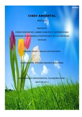 1) El documento describe un proyecto escolar sobre las consecuencias del cambio climático y acciones para generar un desarrollo sostenible. 2) El proyecto se implementará en una escuela primaria y busca crear conciencia sobre la adaptación al cambio climático. 3) El diseño metodológico incluye talleres, capacitaciones, y actividades prácticas para fomentar valores ambientales y medidas de mitigación y adaptación al cambio climático.