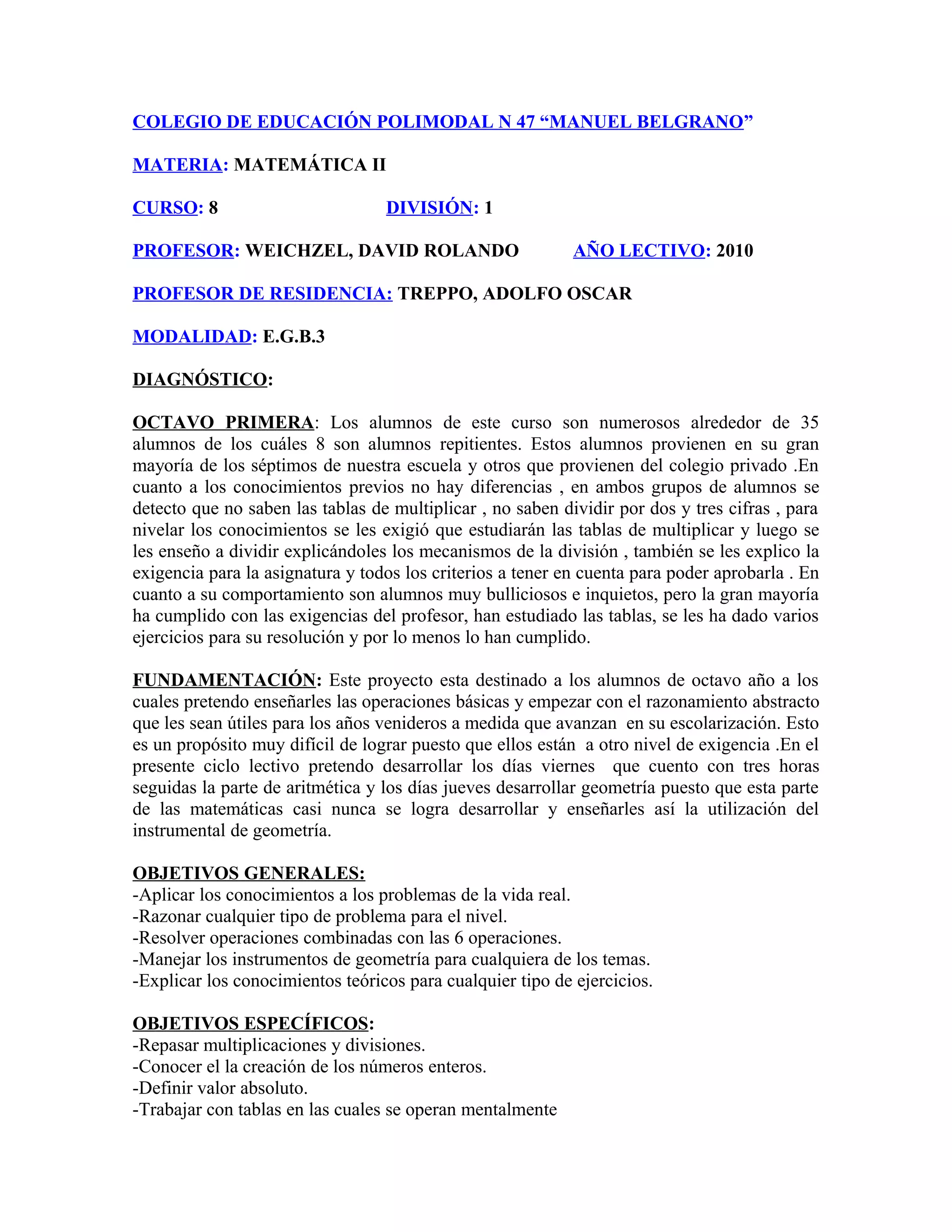Este documento presenta el plan de estudios de Matemática II para el octavo grado en la Escuela Polimodal N°47 "Manuel Belgrano". Describe que los alumnos tienen deficiencias en tablas de multiplicar y división. El objetivo es enseñar operaciones básicas, razonamiento abstracto y geometría. El plan consta de tres unidades sobre números enteros, racionales y geometría evaluadas a través de exámenes y tareas.