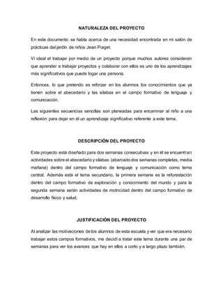 Este documento presenta un proyecto educativo de dos semanas sobre el abecedario y las silabas para niños de preescolar. El proyecto incluye actividades para reforzar el conocimiento del abecedario, ampliar el conocimiento de las silabas y la escritura de palabras, así como temas secundarios sobre reforestación y motricidad. El objetivo es dejar un aprendizaje significativo en los estudiantes sobre el abecedario a través de estrategias como el trabajo colaborativo y el juego.