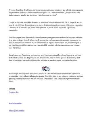 Google está desarrollando el Proyecto Ara, un teléfono modular donde el usuario puede intercambiar y personalizar módulos como la pantalla, cámara y procesador. El teléfono consiste en un marco de aluminio que conecta 10 áreas modulares. Esto permitirá a los usuarios actualizar solo ciertos módulos en lugar de reemplazar el teléfono completo, ahorrando dinero. El primer prototipo llegará a Puerto Rico este año y los módulos individuales estarán disponibles para compra en una tienda en línea.