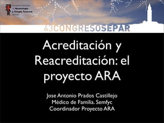 El documento habla sobre la acreditación y reacreditación de profesionales sanitarios. Explica que la acreditación demuestra la competencia profesional al final de la residencia y que la reacreditación demuestra el mantenimiento de dicha competencia de forma periódica. También describe el proyecto ARA liderado por varias sociedades científicas españolas para establecer procesos de evaluación de competencias válidos, fiables y flexibles.