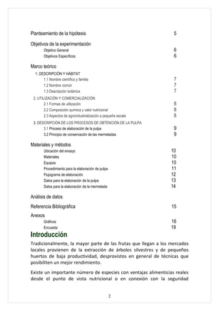 Este documento presenta un proyecto de investigación sobre el aprovechamiento de la pulpa del arazá (Eugenia stipitata) para la elaboración de jugos y mermeladas. El objetivo general es aprovechar las propiedades nutricionales del arazá para producir productos alimenticios de fácil acceso. Se realizará un análisis de las características y usos del arazá, la elaboración de pulpa congelada, y la evaluación de la aceptación de los productos por los consumidores. El marco teórico inclu