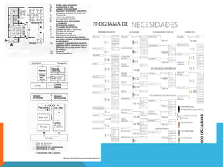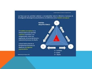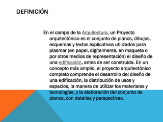 El proceso de diseño de un proyecto arquitectónico incluye 7 etapas: 1) investigación y definición del programa, 2) diagrama de relaciones de espacios, 3) esquema básico, 4) anteproyecto preliminar, 5) proyecto básico con planos y memoria, 6) proyecto de ejecución detallado, 7) construcción del edificio. El diseño traduce los resultados de la investigación inicial en formas que cumplen con las necesidades y función del proyecto.