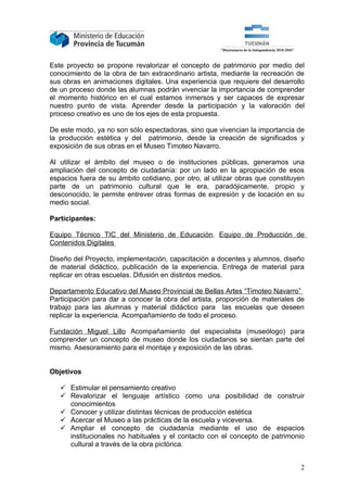 Este proyecto buscó que las alumnas de una escuela se convirtieran en protagonistas de su cultura a través de la creación de animaciones digitales basadas en la obra del artista Ezequiel Linares, experimentando el proceso creativo y aprendiendo sobre el contexto histórico representado. Las alumnas visitaron un museo para inspirarse en la obra de Linares, luego aprendieron técnicas de animación digital y crearon sus propias animaciones que finalmente expusieron en el museo, adquiriendo una nueva comprensión del