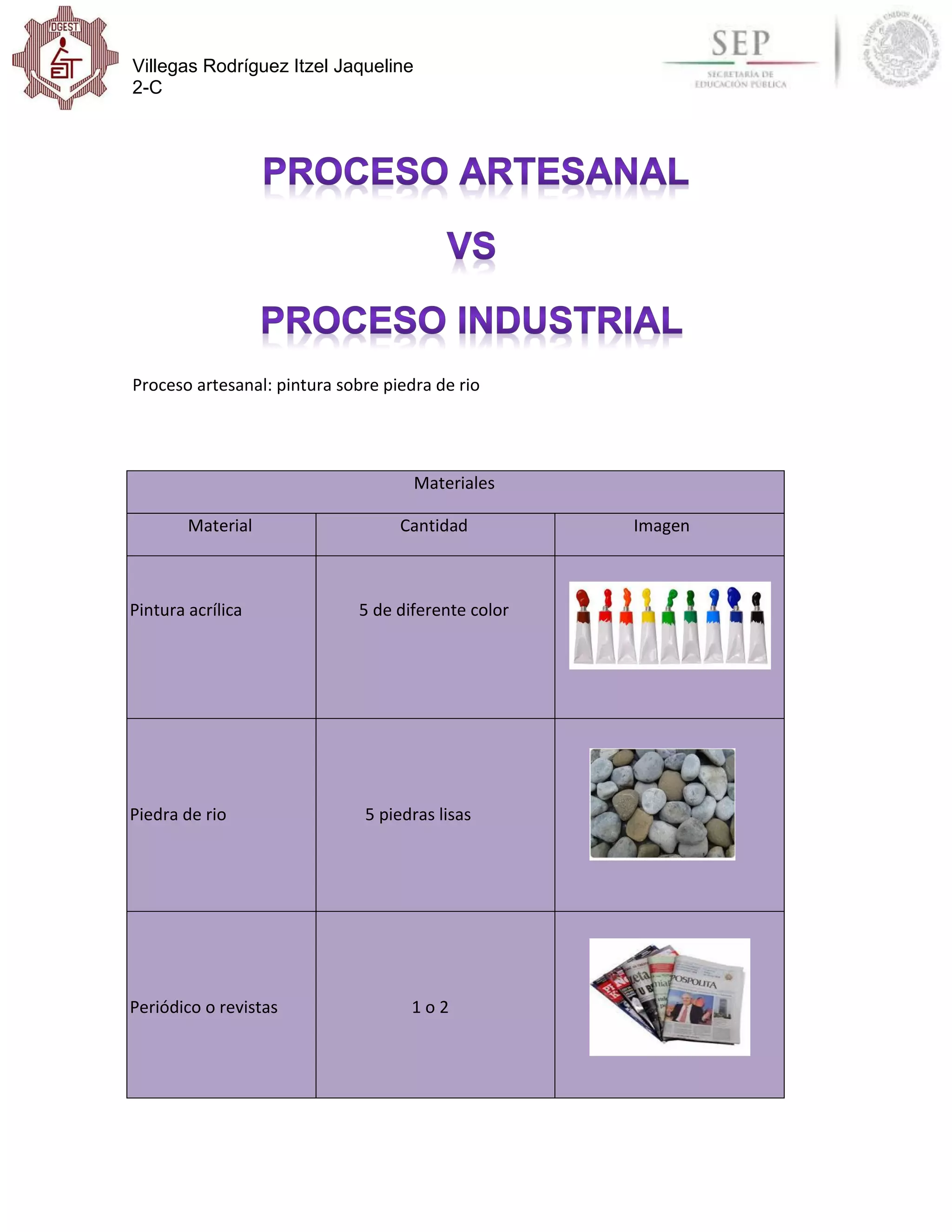 El documento describe un proceso artesanal para pintar piedras de río. Incluye una lista de materiales necesarios como pintura acrílica, piedras lisas, pinceles, barniz y hojas de color. Explica los pasos del proceso que incluyen lavar y secar la piedra, dibujar un diseño, pintarlo, dejarlo secar, barnizarlo y pegarlo a una base de hojas de color. Al final, menciona algunas ventajas como fomentar la creatividad y relajación.