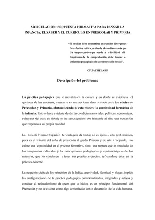 Este documento describe un proyecto de investigación para mejorar la articulación entre los niveles de preescolar y primaria en la Escuela Normal Superior de Cartagena de Indias. Actualmente existe una ruptura entre los niveles que obstaculiza la continuidad formativa de los niños. El proyecto busca identificar los obstáculos epistemológicos y conceptualizar teorías sobre infancia, saber y currículo para diseñar una propuesta curricular articulada que supere esta ruptura y promueva un desarrollo integral de los niños.