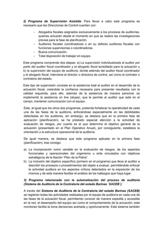 El proyecto presentado tiene como objetivo fortalecer la labor de auditoría de la Contraloría del estado Barinas mediante la implementación de tres programas: 1) Capacitación auditora para supervisores y auditores, 2) Supervisión asistida del proceso de auditoría, y 3) Un sistema automatizado para registrar las actividades de auditoría y dar seguimiento a los casos. Los programas se enfocan en mejorar las etapas de planificación, ejecución, presentación de resultados y seguimiento de las auditorías.