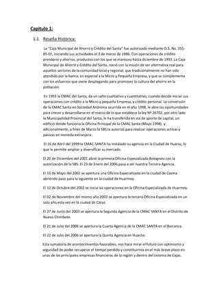 El documento proporciona un resumen de los principales procesos del área de créditos de la Caja Municipal de Ahorro y Crédito del Santa. Describe la historia de la institución, el análisis de créditos, incluyendo los pasos para la concesión y administración de créditos, así como los riesgos asociados. También presenta consideraciones generales sobre la evaluación de créditos a empresas.