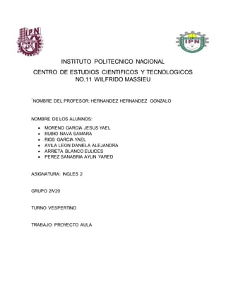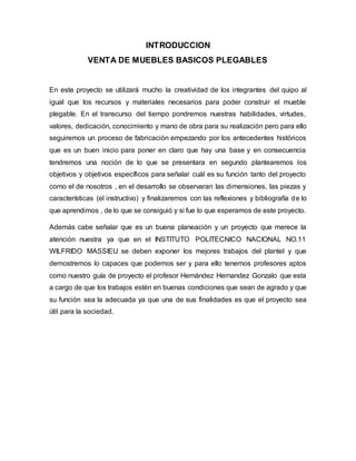 Este documento presenta un proyecto de estudiantes del Instituto Politécnico Nacional sobre la creación de una línea de muebles plegables. El proyecto es dirigido por el profesor Hernández Hernández Gonzalo y tiene como objetivo principal la comercialización de los muebles. Los estudiantes detallan los objetivos generales y específicos, e incluyen secciones sobre antecedentes históricos, instructivo, reflexiones finales y bibliografía.