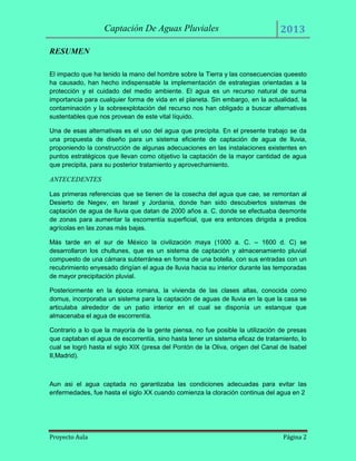 El documento describe los sistemas de captación de agua de lluvia, destacando su importancia como alternativa sustentable para proveer agua. Explica que existen diferentes métodos para recolectar el agua precipitada, como utilizar techos o superficies permeables, e instalar filtros, cisternas y tuberías para almacenar y distribuir el agua captada. Además, resalta las ventajas ambientales y sociales de este sistema, como proveer agua de alta calidad de manera independiente y empleando mano de obra local con materiales