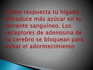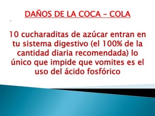 El documento describe los efectos negativos del consumo de Coca-Cola en la salud. Al beber Coca-Cola, 10 cucharadas de azúcar entran en el sistema digestivo, causando picos de azúcar e insulina. Además, la cafeína dilata las pupilas y estimula los centros de placer del cerebro. El ácido fosfórico bloquea nutrientes y acelera el metabolismo. A largo plazo, los refrescos pueden generar adicción. Finalmente, el documento concluye que es necesario reducir el consumo