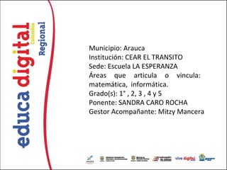 Este documento describe un proyecto para eliminar el temor a las matemáticas en estudiantes de primaria utilizando las TIC. El proyecto usa herramientas digitales como Eduteka y Colombia Aprende para que los estudiantes descubran relaciones matemáticas de una manera lúdica. El proyecto tiene objetivos de promover el aprendizaje de números, formas geométricas y medidas, y crear un espacio donde los estudiantes puedan resolver problemas y compartir ideas.