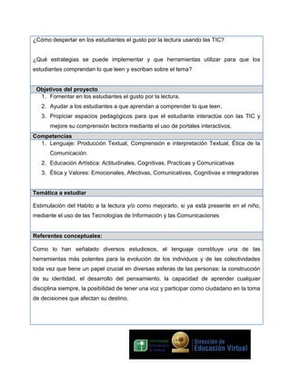 Este proyecto busca despertar el placer de la lectura en los estudiantes de 3er grado mediante el uso de las TIC. Se implementarán estrategias como el uso de portales interactivos y herramientas digitales para hacer la lectura más entretenida. El proyecto tendrá una duración de 2 meses e involucrará a docentes y estudiantes. Se espera que los estudiantes desarrollen el hábito de la lectura y mejoren su comprensión lectora a través de este enfoque basado en las TIC.