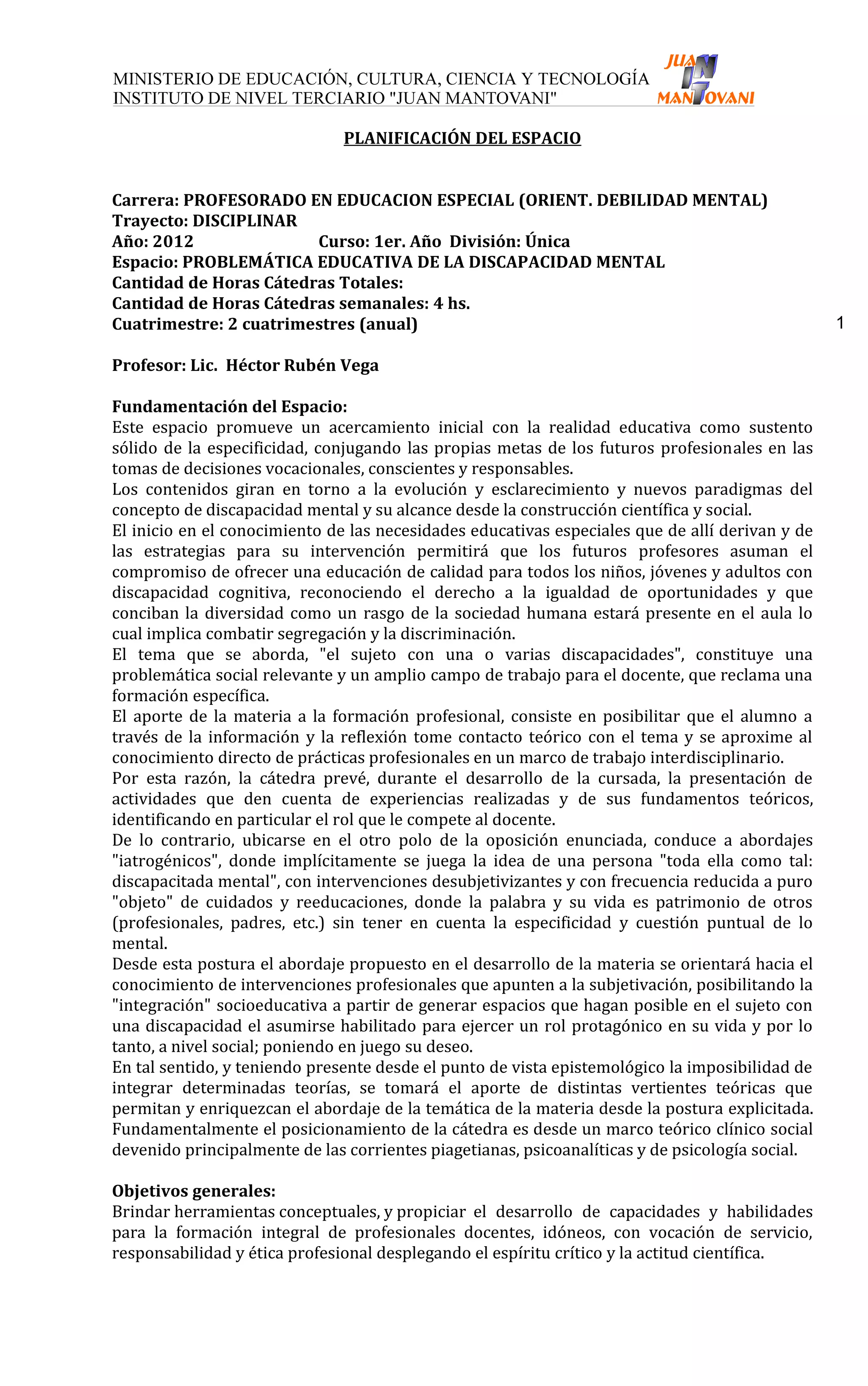 Este documento presenta la planificación del espacio académico "Problemática Educativa de la Discapacidad Mental" para el primer año de la carrera de Profesorado en Educación Especial con orientación en Debilidad Mental. El espacio abordará conceptos y estrategias relacionadas a la discapacidad mental y las necesidades educativas especiales desde un enfoque de integración e inclusión. Los objetivos son brindar herramientas conceptuales y desarrollar una postura ético-profesional que reconozca la subjetividad de las personas