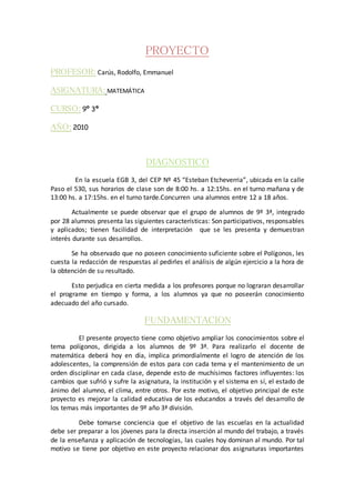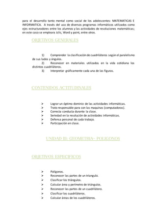 Este proyecto tiene como objetivo mejorar los conocimientos de los estudiantes de 9o grado sobre polígonos a través de actividades informáticas. Busca que los estudiantes comprendan la clasificación de cuadriláteros y calcular sus áreas y perímetros. El proyecto se implementará durante el segundo bimestre a través de lecciones y actividades prácticas utilizando programas informáticos.