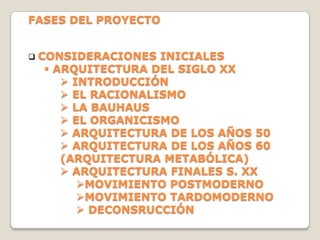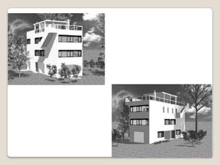 Este documento resume los principales movimientos arquitectónicos del siglo XX, incluido el racionalismo y la arquitectura orgánica. Explica los cinco puntos de Le Corbusier para una nueva arquitectura: pilotis, techo-jardín, planta libre, fachada libre y ventana alargada. Detalla la evolución de las Casas Citrohan de Le Corbusier y cómo llegó a sistematizar sus cinco puntos a través del análisis de estas viviendas prototipo.