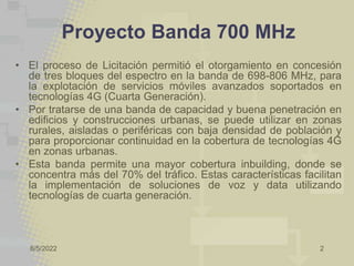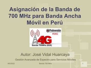 La banda de 700 MHz fue asignada para servicios móviles avanzados 4G en Perú a través de una licitación. Tres bloques fueron concedidos a Entel Perú, América Móvil Perú y Telefónica del Perú, recaudando el Estado peruano US$ 911.2 millones. La banda permite mayor cobertura en interiores y áreas rurales, expandiendo el acceso a internet móvil de alta velocidad en todo el país.