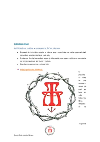 Este documento describe un proyecto para crear una biblioteca virtual en el Colegio Monseñor Terrero. El proyecto involucra diseñar un sitio web con enlaces a los libros y materiales de cada curso y materia, para que los estudiantes puedan acceder a la información de forma remota. El objetivo es reducir el peso de las mochilas de los estudiantes y motivarlos a usar la tecnología con fines educativos de manera más atractiva.