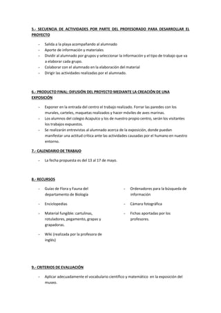 Este proyecto interdisciplinar tuvo como objetivo estudiar la flora, fauna y recursos naturales de las playas de Fuengirola. Se llevaron a cabo diversas actividades en diferentes áreas como biología, idiomas, dibujo y matemáticas para investigar e identificar la biodiversidad local y el impacto humano. Finalmente, los estudiantes expusieron sus hallazgos a través de murales, entrevistas y vídeos en una exposición para concienciar sobre la protección del medio ambiente costero.