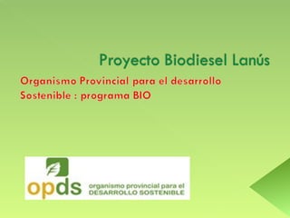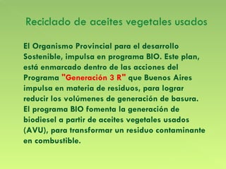 El programa BIO de la provincia de Buenos Aires promueve la generación de biodiesel a partir de aceites vegetales usados para reducir la contaminación y producir combustibles renovables. El aceite usado se recolecta a través de organizaciones barriales y se envía a plantas productoras de biodiesel. A partir de 2010, la ley argentina exige que el 5% del diesel sea biodiesel, lo que generará demanda para el biodiesel producido a través de este programa.
