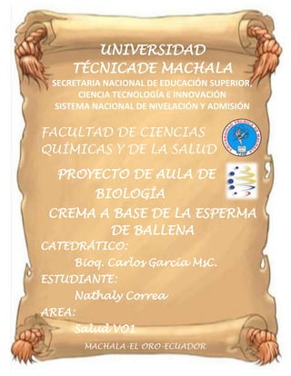 Este documento presenta un proyecto para elaborar una crema hidratante a base de esperma de ballena. El proyecto incluye la justificación, objetivos, planificación, presupuesto, preparación de la crema y conclusiones. La crema utilizará espermaceti como fuente de vitamina E y otros ingredientes como cera de abejas, lanolina y aceite de almendra para hidratar la piel y protegerla de los rayos UV.