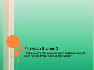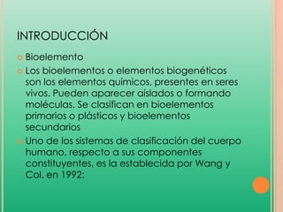 Este documento describe los principales bioelementos que son importantes para el cuerpo humano. Explica que los bioelementos primarios como el carbono, hidrógeno, oxígeno y nitrógeno constituyen el 95% de la masa del cuerpo. También describe los bioelementos secundarios como el sodio, potasio, calcio y magnesio, que son esenciales a pesar de estar presentes en menor cantidad. Finalmente, señala que oligoelementos como el hierro, yodo y flúor son necesarios a niveles de traza para el bu