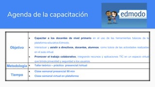 Este documento presenta una capacitación sobre el uso de la plataforma educativa Edmodo. La capacitación consta de 4 módulos que cubren la creación de grupos y clases, asignación de tareas, pruebas y encuestas. El objetivo es capacitar a docentes sobre las herramientas básicas de Edmodo para promover el trabajo colaborativo y la integración de recursos educativos digitales en un espacio virtual seguro.