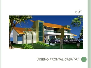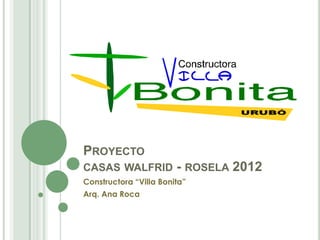 El documento presenta los diseños frontales de dos casas, la Casa "A", durante el día y la noche. Muestra los planos de la fachada principal de la Casa "A" de un proyecto inmobiliario llamado "Casas Walfrid" realizado por la constructora "Villa Bonita" y diseñado por la arquitecta Ana Roca.