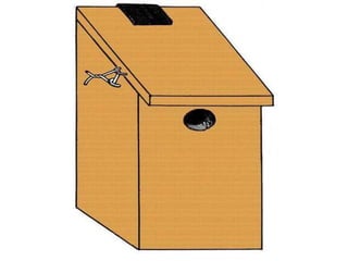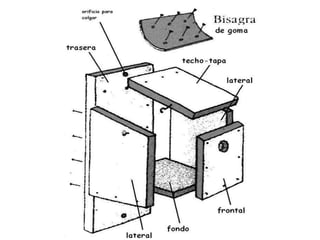 El documento proporciona instrucciones para diseñar y construir una caseta nido para pájaros. Debe tener una abertura para la entrada de los pájaros, perchas para que se posen, y dimensiones máximas de 10 cm de ancho y 13 cm de alto. Se deben utilizar materiales como panel de marquetería de 4 mm y cola blanca. La caseta debe proteger de la lluvia y ser fácil de limpiar y colocar en un árbol.