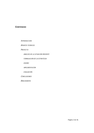 El documento detalla un proyecto de gestión del conocimiento en empresas, destacando su importancia y las fases clave para su implementación: análisis de la situación actual, formulación de estrategia, diseño, implementación y evaluación. Además, se discuten las características del conocimiento y su relación con el capital humano, así como la necesidad de una cultura organizacional que fomente la comunicación y la innovación. La gestión del conocimiento se presenta como fundamental para generar ventajas competitivas sostenibles en el tiempo.
