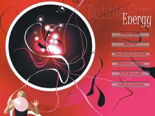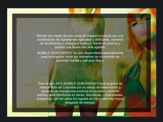 El documento presenta un plan de negocios para el lanzamiento de una nueva goma de mascar energética llamada BUBBLE GUM ENERGY. El producto contiene yerba mate y otros ingredientes naturales y artificiales para aumentar la energía y rendimiento de jóvenes y adultos con estilos de vida agitados. El objetivo es ser la marca líder en Colombia para el 2015 mediante la distribución en bares, universidades y otros lugares frecuentados por jóvenes. El plan describe los beneficios del producto, el mercado objetivo, la estrategia