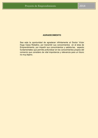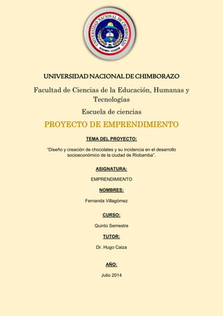 Este documento presenta un proyecto de emprendimiento para la venta y distribución de chocolates en la ciudad de Riobamba, Ecuador. El proyecto tiene como objetivo principal distribuir 30 chocolates de buena calidad a precios accesibles. El proyecto justifica la venta de chocolates debido a que es un producto que se distribuye bien y podría generar ganancias. Se presenta un cronograma y presupuesto para la compra de los materiales, venta de chocolates y ganancias esperadas del proyecto a lo largo de 3 meses.