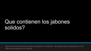 Este documento describe cómo hacer jabones sólidos de forma casera. Explica que los jabones están compuestos de ácidos grasos y álcalis y que su proceso de elaboración implica rayar o picar jabón neutro, derretirlo en el horno de microondas y verterlo en moldes para que se endurezca. También enumera los materiales necesarios y los pasos básicos del procedimiento que incluyen rayar el jabón, derretirlo y decorar los moldes antes de dejarlos secar.