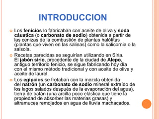 El documento proporciona información sobre el origen e historia del jabón, desde su fabricación por los fenicios usando aceite de oliva y soda cáustica hasta su evolución actual. Explica que los egipcios usaban una mezcla de natrón, arcilla y altramuces para lavarse, y que los romanos contribuyeron a su expansión. También incluye el procedimiento para elaborar jabón casero y conclusiones sobre la importancia de mezclar bien los ingredientes.