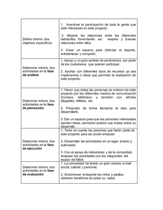 El documento describe un proyecto de la comunidad El Porvenir para crear un club de fútbol llamado "Los magos de la esférica". El proyecto fue desarrollado por un grupo diverso de personas para mejorar la calidad de vida de la comunidad. El proyecto se implementa en cuatro fases: análisis, planeación, ejecución y evaluación.