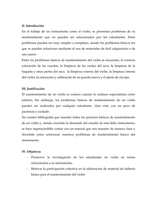 El proyecto colaborativo entre dos instituciones educativas tiene como objetivo elaborar materiales para el mantenimiento básico del violín utilizando recursos caseros, a través de la producción de videos educativos que serán publicados en un blog. Los estudiantes aprenderán sobre la estructura del violín y técnicas básicas de mantenimiento aplicando metodologías interactivas como el webquest y el blog. El proyecto se evaluará con base en las actividades planteadas en el cronograma y las fichas de evaluación del webquest.
