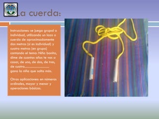 Este documento describe varios juegos matemáticos tradicionales que se pueden utilizar para enseñar conceptos matemáticos de manera divertida. Entre los juegos descritos se incluyen la cuerda, el trompo, el capirucho, el avión, la lotería, el yax, los dados, la cuarta, la perinola, la hula hula, la liga y la tenta encantada. Cada juego incluye instrucciones sobre cómo jugar y ejemplos de conceptos matemáticos como números, operaciones