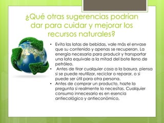 El documento presenta sugerencias para cuidar y mejorar los recursos naturales, como evitar las latas de bebidas y pensar en reutilizar, reciclar o reparar los objetos antes de desecharlos. También recomienda no comprar productos innecesarios. Explica que los recursos naturales incluyen recursos continuos, renovables y no renovables, y que la contaminación incluye tipos como la atmosférica, hídrica, de suelo y basura.