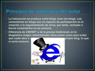 Este documento discute la netiqueta y los comentarios en blogs. Explica que los comentarios son un espacio para participar y debatir ideas de otros, y que rechazar o eliminar comentarios no es censura a menos que impidan que otros expresen sus propias opiniones. También establece pautas para los comentarios, como que deben ceñirse al tema, no incluir insultos ni spam, y cumplir con las normas básicas de comunicación en línea.