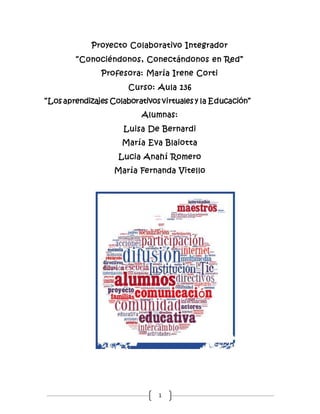 Este documento presenta un proyecto colaborativo que busca mejorar la comunicación entre la escuela, los estudiantes, las familias y la comunidad a través de la creación de una plataforma en línea que incluya un sitio web, página de Facebook, blog y canal de YouTube. El proyecto tiene como objetivo promover el intercambio de información sobre las actividades escolares y fomentar el aprendizaje colaborativo mediante el uso de las TIC.