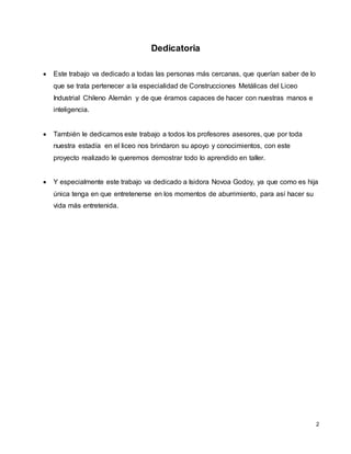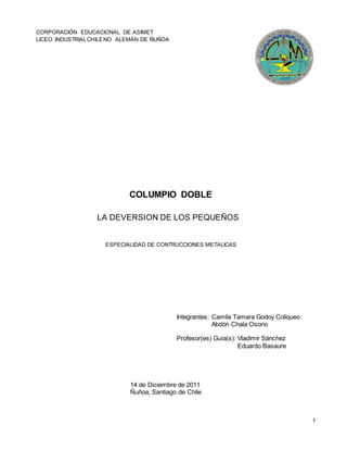 Este documento presenta los detalles de un proyecto para construir un columpio doble de metal. El proyecto incluye un análisis FODA, una metodología detallada con una tabla Gantt, y una descripción paso a paso de cómo se construirá el columpio en etapas que incluyen cortar y soldar los perfiles metálicos, hacer un atiesador de soporte, e instalar las sillas. El objetivo general es crear un columpio estéticamente adecuado para entretener a los niños de manera seg