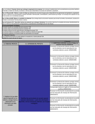 Este proyecto busca determinar los procesos de importación y exportación de bienes y servicios para aplicar transacciones comerciales internacionales. El proyecto se llevará a cabo durante 24 meses e involucrará a aprendices en su formación. El proyecto consta de cinco fases: análisis, planeación, ejecución, evaluación y práctica empresarial. El objetivo es capacitar a los aprendices en los procesos de comercio internacional de acuerdo con la normatividad vigente.