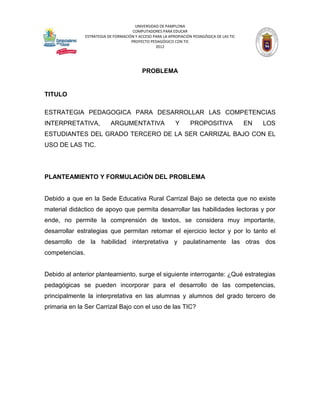 Este documento presenta una estrategia pedagógica para desarrollar las competencias interpretativa, argumentativa y propositiva en estudiantes de tercer grado de una escuela rural en Colombia mediante el uso de las TIC. Describe el problema de falta de material didáctico para apoyar las habilidades lectoras. Los objetivos son diagnosticar y presentar estrategias para mejorar la comprensión lectora usando las TIC. Se aplicarán instrumentos de diagnóstico, se analizarán los resultados y se implementarán estrategias didácticas con las TIC para