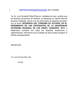 Este documento trata sobre la incidencia del consumo de alcohol en el rendimiento de los estudiantes de la Universidad Autónoma Regional de los Andes ("UNIANDES") en 2013. Presenta los antecedentes de investigación sobre el alcoholismo, la situación problemática planteada, los objetivos y la justificación del estudio. Explica brevemente la metodología empleada y la estructura de la tesis. El documento analiza cómo el consumo de alcohol entre los jóvenes ha aumentado, especialmente los fines de semana, y cómo esto puede afectar negativamente